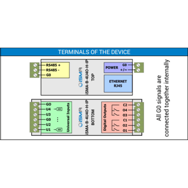 Ces modules iSMA-B-4U4A-H-IP sont disponibles avec 1 port IP et un port RS485 (fonction « passerelle Modbus RS485/IP » qui permet la reprise de modules et/ou équipements Modbus RS485 supplémentaires).